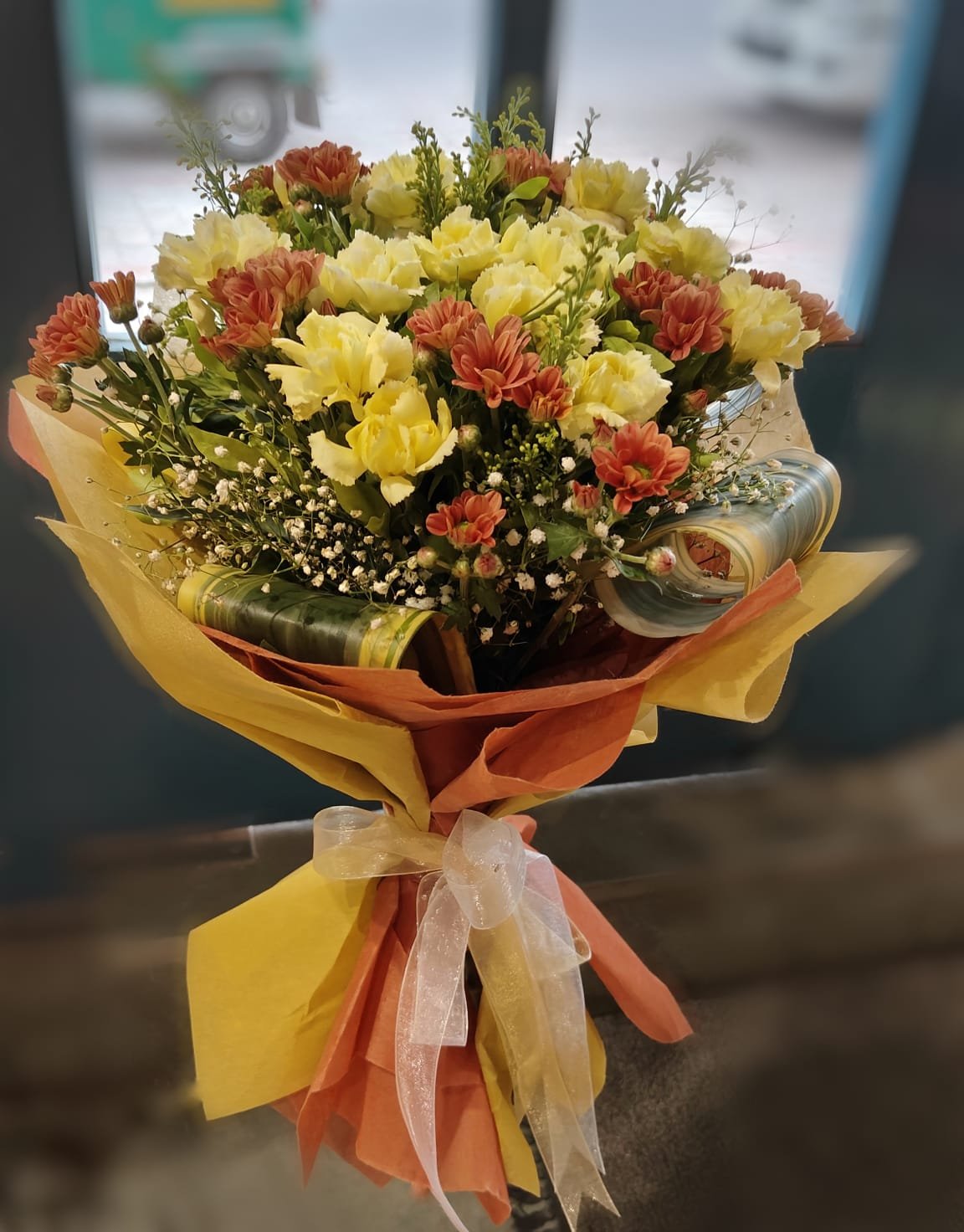 Sunshine Glory is a cheerful floral arrangement crafted with vibrant chrysanthemums, soft carnations, and delicate gypso in uplifting shades of yellow and orange. This warm-toned bouquet is perfect for spreading smiles, celebrating new beginnings, or simply brightening someone’s day.